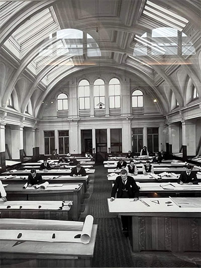 the majority of the ocean liners for White Star Lines in the early 20th century—including the trio Olympic, Titanic and Britannic. The restaurant is named Drawing Office 2 and you can see from where it gets its name! |